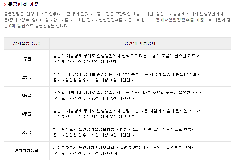 노인장기요양보험 등급판정 기준은 아래의 표와 같고, 신청을 하게 되면 건강관리공단에서 직원이 나와서 등급 심사를 하게 됩니다.